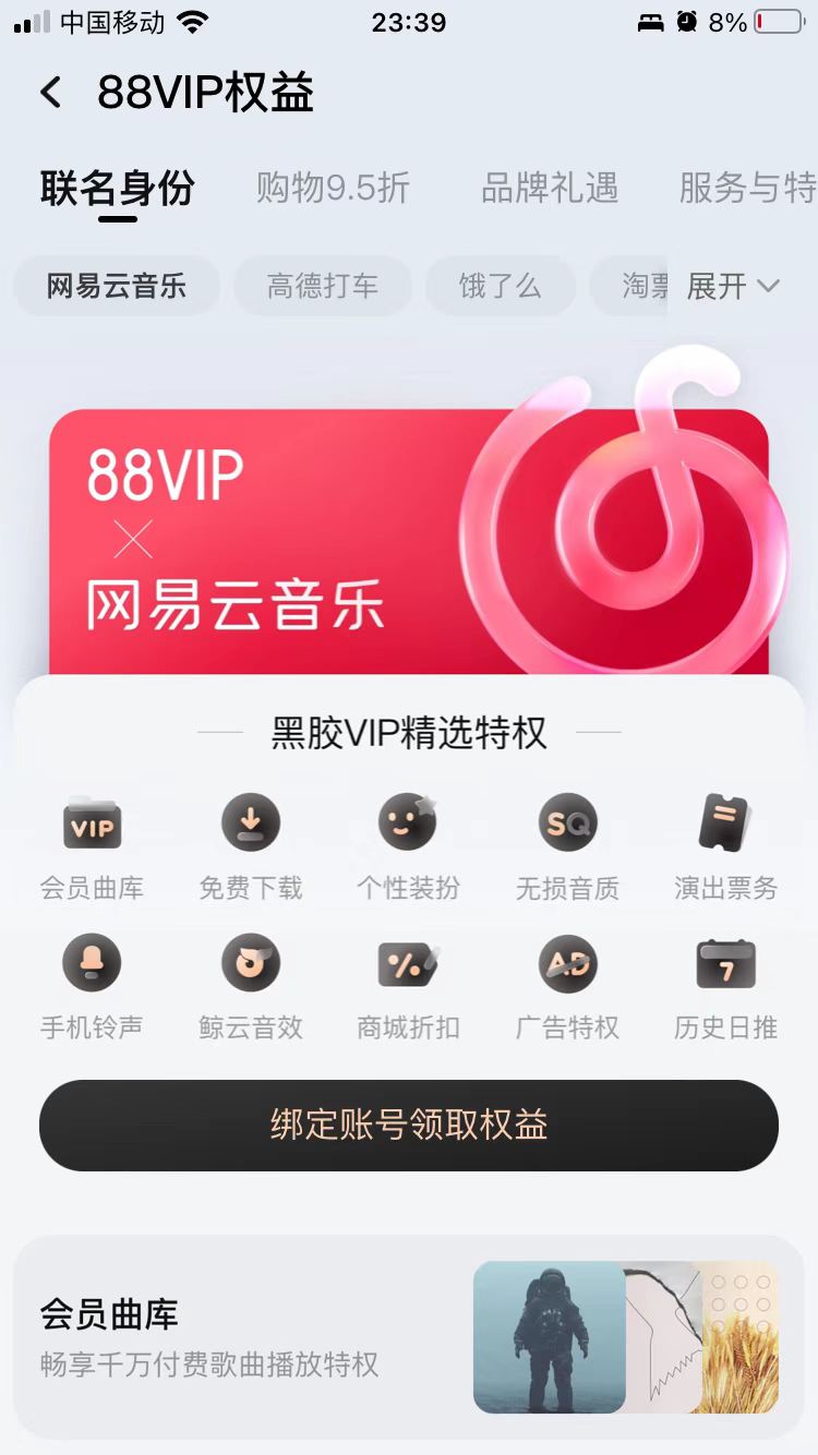 新窗口显示作为联名身份的“网易云音乐”,其“黑胶VIP”所具有的精选特权,点击“绑定账号领取权益”按钮;