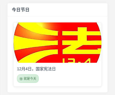 为了增加节日文章的曝光率,我之前是在网站侧边栏添加了一个“本月纪念日”的文章聚合,但每月要手动指定拟显示的文章,有点麻烦。我想能不能显示当天的节日文章,比如今天是12月4日,就显示“12月4日,国家宪法日”,有多个节日的就显示多个卡片,这样就省去了手动添加的麻烦,而且显示的是当天的节日,对访客更加友好。