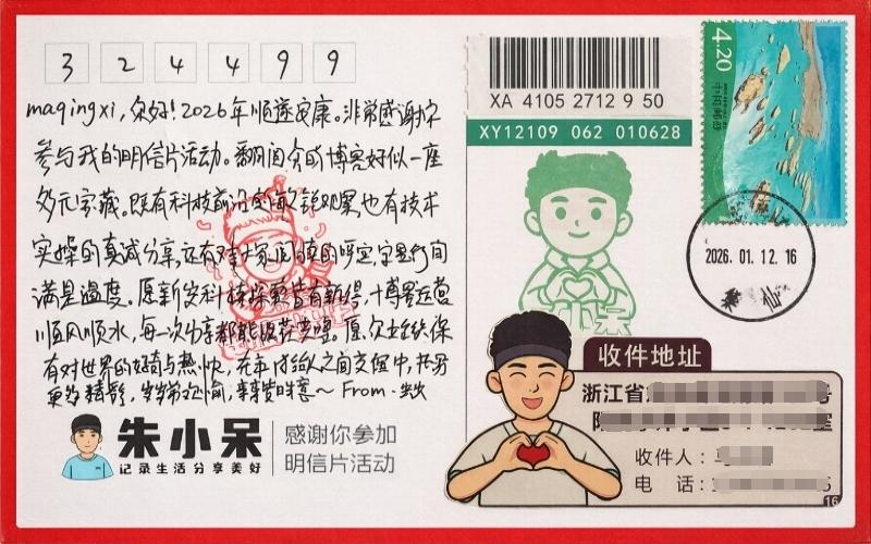 明信片是网友朱小呆寄来的,正面是2026新年祝福“岁岁常欢愉、年年皆胜意”,卡通形象加上了喜庆的红色,可爱又温暖,节日感瞬间拉满。背面的书信内容更是走心:
