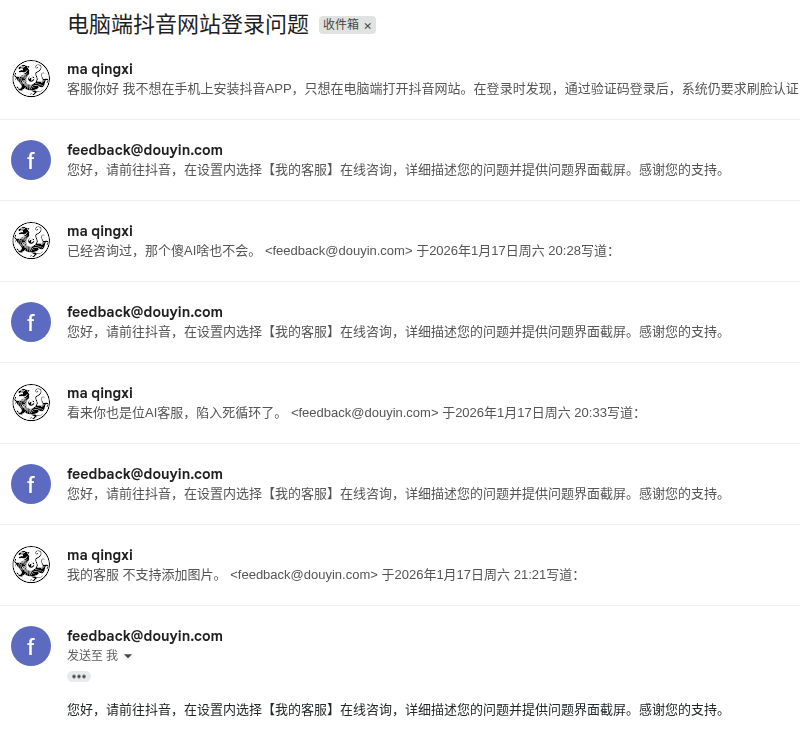 其次,我找到 关于抖音 - 联系我们,看到有官方邮箱 feedback@douyin.com ,于是给它们发了邮件,描述了我的问题,邮件回复说:您好,请前往抖音,在设置内选择 [ 我的客服 ] 在线咨询,详细描述您的问题并提供问题界面截屏。感谢您的支持。而且无论你发什么内容,它就这一句话来回复。这又是一个傻逼 AI 客服。