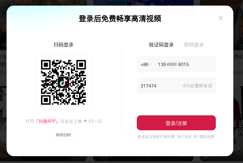 打开抖音网页版(www.douyin.com),首先弹窗就是登录界面,抖音提供了三种登录方式:扫码登录、验证码登录和密码登录。“扫码登录”需要打开 抖音APP 进行扫一扫,我手机没安装 抖音APP ,所以此选项放弃,我选择了“验证码登录”。