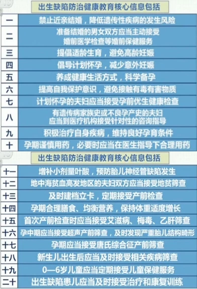 宣传出生缺陷防治科学理念、主要方法,推广出生缺陷防治核心信息,提倡适龄人群主动学习掌握出生缺陷防治知识、增强预防意识和能力、养成健康生活方式、选择最佳生育年龄、积极孕育健康新生命;倡导新婚、备孕人群有准备怀孕生育,孕产妇规范参加孕期保健和产前筛查,家长主动带新生儿接受遗传代谢病、听力障碍等筛查;有条件地区开展婚育健康知识进企业、社区、校园活动,扩大宣传覆盖范围。